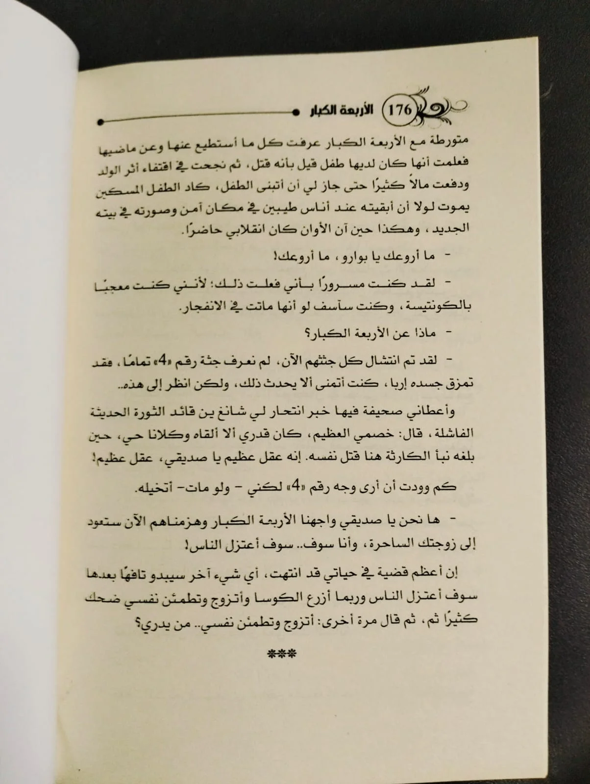 *”الأربعة الكبار”* هي رواية مثيرة مليئة بالتشويق، وتُعتبر من أبرز أعمال أجاثا كريستي التي أظهرت براعتها في الخداع الأدبي وفي حبك الروايات البوليسية التي تعتمد على التحليل الدقيق للأشخاص والأحداث