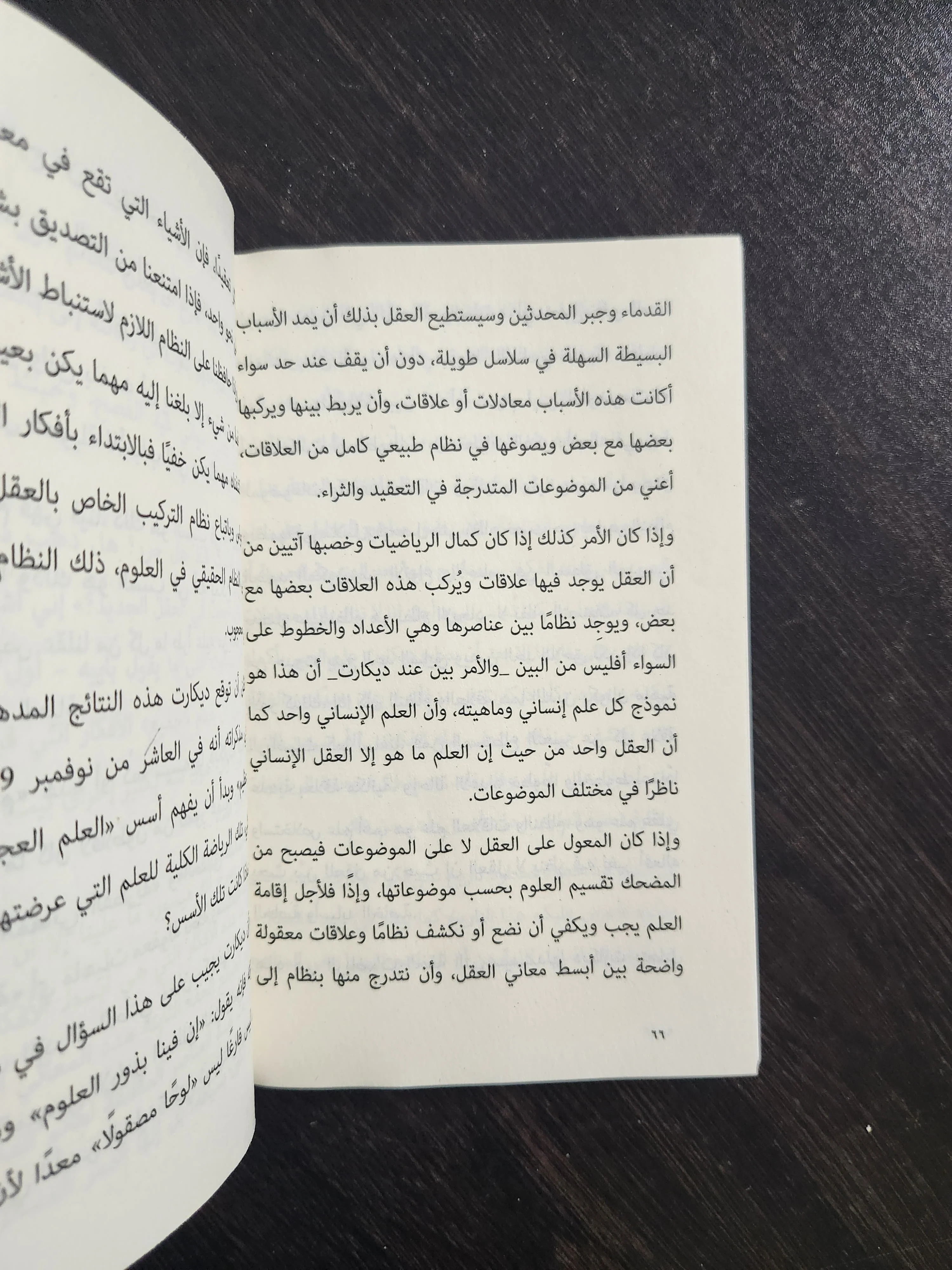 الكتاب بسيط يمكن إنهاؤه بجلسة واحدة لكنه يغريك لتقرأ كتاب ديكارت مقال في المنهج. الكتاب هو عبارة عن ثلاث محاضرات ألقاها ألكسندر كواريه، بمناسبة مرور ٣٠٠ عام على كتاب مقال في المنهج لديكارت. والتي تعتبر مناسبة كبيرة لما كان من اثر لصدور هذا الكتاب على العالم أجمع حتى اليوم