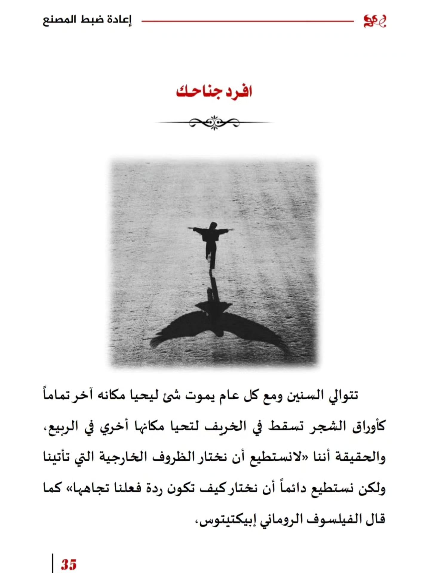 هو كتيب يحتوي علي مجموعة من المقالات التي تساعدك علي رؤية العالم من منظور آخر.. فنحن نحتاج إلي إعادة ضبط المصنع من حين إلي آخر لنمحي المدخلات السلبية والخاطئة التي تصل إلينا من كل حدب.. نحتاج أن نعود إلي وضعنا الطبيعي.. إلي الفطرة السليمة التي فطرنا الله عليها و أن نعيد ضبط مشاعرنا و أفكارنا.. و يجب أن نتوقف عن الجري قليلاً لنأخذ أنفاسنا ونعلم إلي أين نحن ذاهبون.. وهل هذه الوجهة الصحيحة أم نحتاج إلي إعادة توجيه؟..